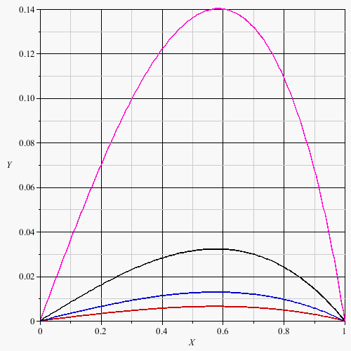 muvals := [-10, -5, -2, -.5]; colors := [red, blue, black, magenta]; display(seq(odeplot(dsolve({eval(ode2, mu = muvals[i]), Y(0) = 0, Y(1) = 0}, Y(X), numeric), color = colors[i]), i = 1 .. nops(muvals)))