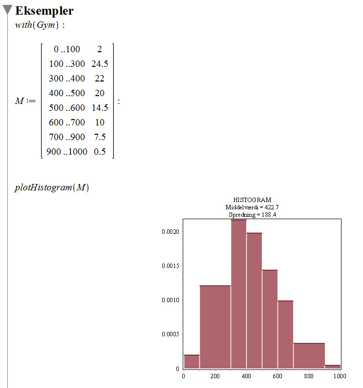 To use Maple in Danish high school a person (not me) has produced a package to make a number of operations more easy for the students. It contains among a lot of other features, a way to create Histograms from grouped data and not only raw data. I am a little puzzled why Maple hasn't got a command, which directly adresses this rather usual situation in Statistics!