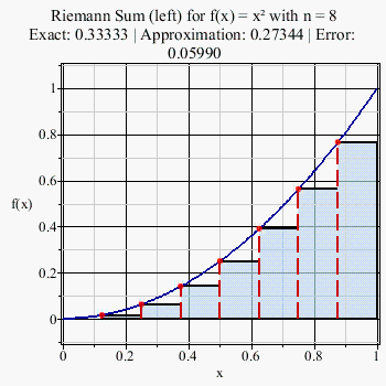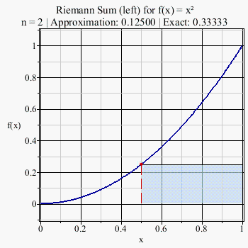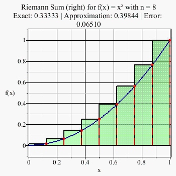 title = sprintf("Riemann Sum (%s) for f(x) = x² with n = %d\nExact: %.5f | Approximation: %.5f | Error: %.5f",