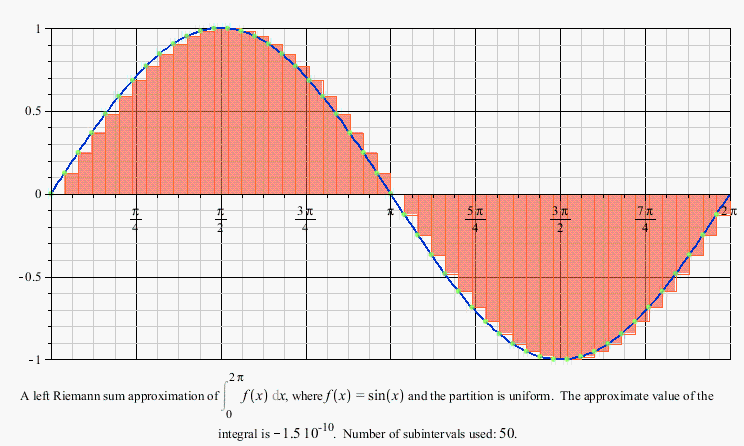 Int(sin(x), x = 0 .. 2*Pi) = Limit(Sum(2*sin(2*Pi*i/n)*Pi/n, i = 1 .. n), n = infinity)