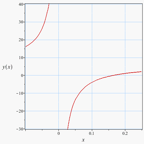 p:=plot(rhs(sol),'axes'='boxed','labels'=[x,y(x)],'axis'=['gridlines'=['color'='lightblue']],'color' = 'red');