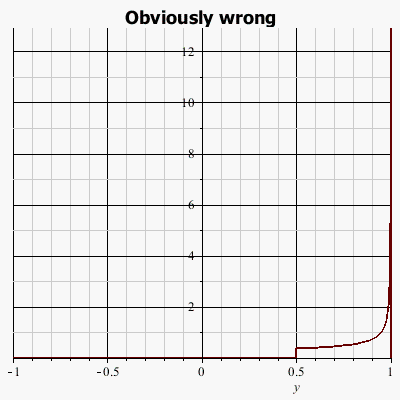 WrongFormulaButCorrectResult := piecewise(y < -1, 0, y = -1, undefined, y < 1, 1/(sqrt(-y^2+1)*Pi), y = 1, undefined, 1 < y, 0)