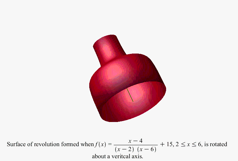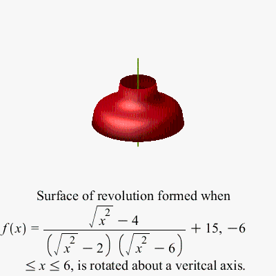 SurfaceOfRevolution(g(x,0), x=-6..6, axis=vertical, output=plot, axes=none);