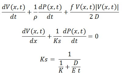 V(x,t) and P(x,t) are the velocity and pressure along the pipe, ρ is the liquid density, D is the pipe diameter, t is the pipe wall thickness, K is the liquid bulk modulus, E is the pipe Young’s modulus, and f is the friction factor.