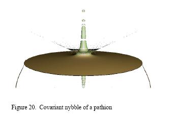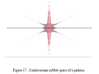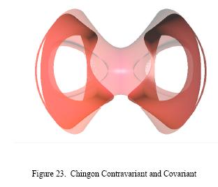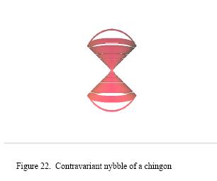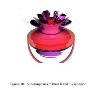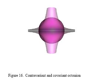 Each quaternion nybble in each hypercomplex fractal space is describing a different perspective of the same fractal. The octonion space is not the same space as the sedenion space. Furthermore, the tradition quaternion fractal is actually the contravariant nybble of the octonion space initializes as a sphere. The covariant nybble of the octonion space initializes as an antisphere or tractrisoid (see figure 16).