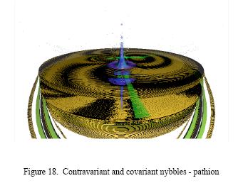 Only where the slices meet at the extrema, is where both the contravariant and covariant cuts are equal. In a firstdegree calculus course, one uses a tool, such as a tangent line, to determine if the curve is increasing, decreasing, or at an extrema. Both the calculus and the contravariant/covariant technique provide visualization hints to the user. Nevertheless, when one move to dimensions higher than 3D, the calculus technique seems to fail us for providing visualizing aides. Yet, the contravariant/covariant technique is still programmable, by a computer, for aiding in visualizing. With 4D slices, one first has an abscissa space and ordinate space. Both spaces share the same abscissa hyper-plane. One shall call the abscissa hyper-plane the horizon, and thus a 4D cut parallel to the horizon is called the contravariant cut. One call each set of fours imaginary components a quaternion nybble (see figure 8, 9, and 10 for example of contravariant and covariant images).