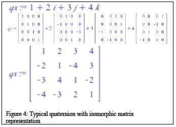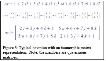 A unique point to demonstrate is that these algebras may be constructed from matrices and hypermatrices. The quaternion’s imaginary components are usually i, j, and k. And, for the octonions the imaginary components are i0, i1, i2, i3, i4, i5, i6, and i7, where i0 is the Real component and i1 to i7 are the imaginary components. For the sedenions the components are e0, e1, e2, e3, e4, e5, e6, e7, … , e15, where e0 is the Real component and e1 to e15 are the imaginary basis components. This doubling process may continues ad infinitum.
