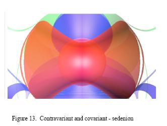 Only where the slices meet at the extrema, is where both the contravariant and covariant cuts are equal. In a firstdegree calculus course, one uses a tool, such as a tangent line, to determine if the curve is increasing, decreasing, or at an extrema. Both the calculus and the contravariant/covariant technique provide visualization hints to the user. Nevertheless, when one move to dimensions higher than 3D, the calculus technique seems to fail us for providing visualizing aides. Yet, the contravariant/covariant technique is still programmable, by a computer, for aiding in visualizing. With 4D slices, one first has an abscissa space and ordinate space. Both spaces share the same abscissa hyper-plane. One shall call the abscissa hyper-plane the horizon, and thus a 4D cut parallel to the horizon is called the contravariant cut. One call each set of fours imaginary components a quaternion nybble (see figure 8, 9, and 10 for example of contravariant and covariant images).