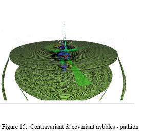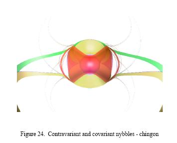 Each quaternion nybble in each hypercomplex fractal space is describing a different perspective of the same fractal. The octonion space is not the same space as the sedenion space. Furthermore, the tradition quaternion fractal is actually the contravariant nybble of the octonion space initializes as a sphere. The covariant nybble of the octonion space initializes as an antisphere or tractrisoid (see figure 16).