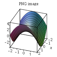 plot3d(x^2-y^2,x=-2..2,y=-2..2,axes=boxed,orientation=[20,60,50],title="PNG image");