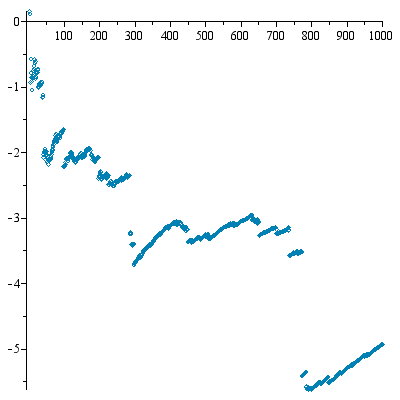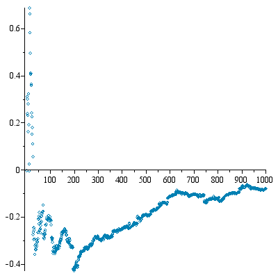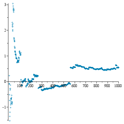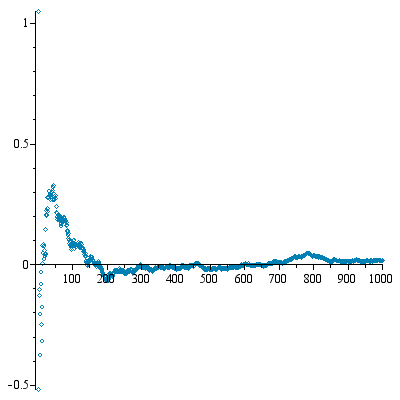As we see, the value truly does not converge; it jumps about very capriciously and even after about 550 points, there is still a substantial jump. These jumps will keep occurring. Compare this to the following graph, which is much smoother:
