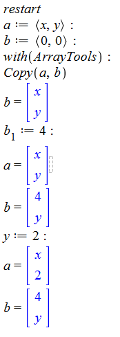 In my second section I am trying to do the job in another way, using the package ArrayTools. Doing it this way seems to work the way I want: Only the copy b is changed. However something really disturbing happens, when I try to assign a value to the variable y. In writing the actual values of the vectors a and b, the value of y isn't substituted in b only a.