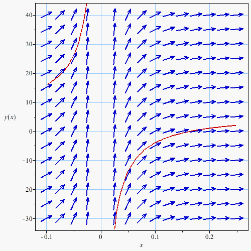 Is there a way to make DEtools:-DEplot do the same? In this case the solution is y(x) = -1/x + 6 and x=0 is singularity. Here is worksheet showing such an example