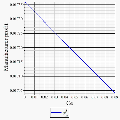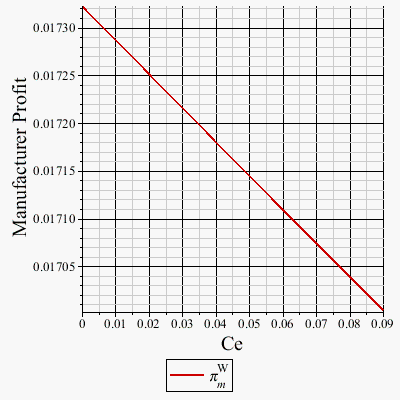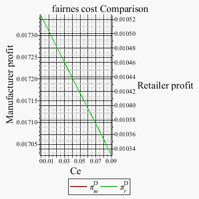 dualaxisplot(plot(`Π_22`, Ce = 0 .. 0.9e-1, color = ["red"], labels = ["Ce", "Manufacturer profit"], labeldirections = ["horizontal", "vertical"], legend = [`#msubsup(mi("Pi"),mi("m"),mn("D"));`]), plot(`Π_2`, Ce = 0 .. 0.9e-1, color = ["green"], labels = ["Ce", "Retailer profit"], labeldirections = ["horizontal", "vertical"], legend = [`#msubsup(mi("Pi"),mi("r"),mn("D"));`]), title = "fairnes cost Comparison")
