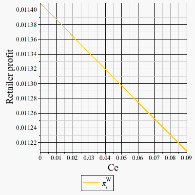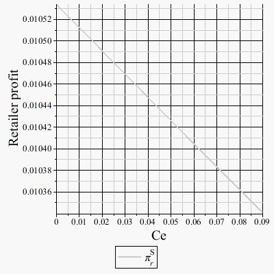 S1 := plot(`Π_1`, Ce = 0 .. 0.9e-1, color = [yellow], labels = ["Ce", "Retailer profit"], labeldirections = ["horizontal", "vertical"], legend = [`#msubsup(mi("Pi"),mi("r"),mn("W"));`]); S2 := plot(`Π_2`, Ce = 0 .. 0.9e-1, color = [black], labels = ["Ce", "Retailer  profit"], labeldirections = ["horizontal", "vertical"], legend = [`#msubsup(mi("Pi"),mi("r"),mn("D"));`]); S3 := plot(`Π_3`, Ce = 0 .. 0.9e-1, color = [grey], labels = ["Ce", "Retailer profit"], labeldirections = ["horizontal", "vertical"], legend = [`#msubsup(mi("Pi"),mi("r"),mn("S"));`])