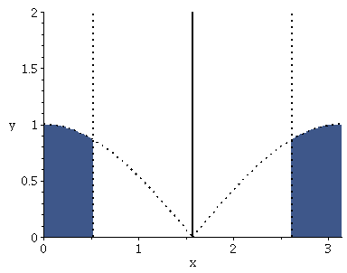 plots:-inequal({sin(x)<1/2,y<abs(cos(x))},x=0..Pi,y=0..2);