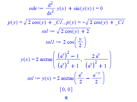 ode:=diff(diff(y(x),x),x)+sin(y(x)) = 0;