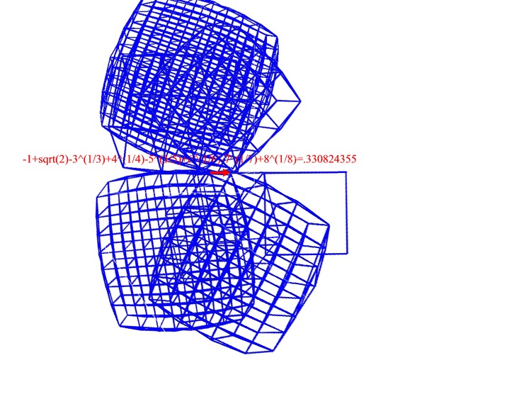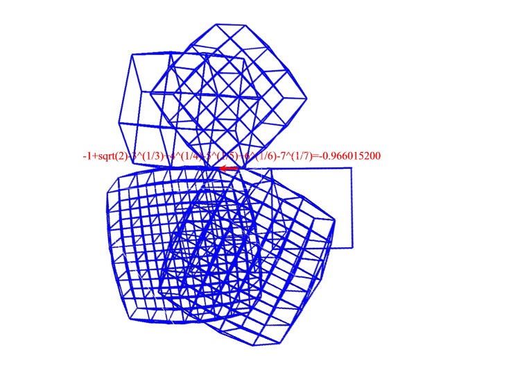 The following mess is a two dimensional projection of the segment, square, cube, tesseract, penteract and hexeract lined up not quite according to Diagram 3. The red segment should  represent 1-sqrt(2)+3^(1/3)+4^(1/4)-5^(1/5)+6^(1/6), but I'm not sure if I kept track of its possition altogether correctly.Furthermore, it is not necessarily to scale.