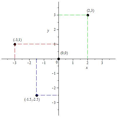 P3:= textplot([[2.2,3.3,"(2,3)"],[-2.8,1.3,"(-3,1)"],[-1.8,-2.8,"(-1.5,-2.5)"],