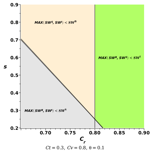 display(inequal({TMA3 > max(TMA1, TMA2)}, Cr = .65 .. .9, s = .2 .. .9, color = "Chartreuse", transparency = .4, optionsclosed = [color = black, thickness = 0.5e-1, transparency = 1.0], optionsopen = [color = black, thickness = 2]), inequal({TMA2 > max(TMA1, TMA3)}, Cr = .65 .. .9, s = .2 .. .9, nolines, color = "LightGray", transparency = .4), inequal({TMA1 > max(TMA3, TMA2)}, Cr = .65 .. .9, s = .2 .. .9, nolines, color = "Moccasin", transparency = .4), textplot([.7, .3, `#msubsup(mi("SW"),mi(""),mn("S"));` > MAX(SW^B, SW^I)], font = [Verdana, 9, bold]), textplot([.85, .6, `#msubsup(mi("SW"),mi(""),mn("I"));` > MAX(SW^B, SW^S)], font = [Verdana, 9, bold]), textplot([.72, .8, `#msubsup(mi("SW"),mi(""),mn("B"));` > MAX(SW^S, SW^I)], font = [Verdana, 9, bold]), labels = [C__r, typeset(s)], labelfont = [Verdana, bold, 14], axesfont = [Verdana, bold, 12], caption = typeset('Ct' = eval(Ct, DATA1), ", ", 'Cv' = eval(Cv, DATA1), ", ", 'theta' = eval(theta, DATA1)))