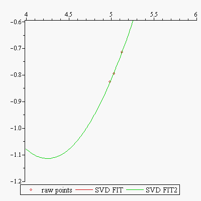 @herclau So first one must correct the cos term your P2 and P3, by multiplying the call to cos() by a factor of 0.5 as mentioned. After doing so then one can get a plot that matches your followup plot on the restricted range 4.0 to 5.7, as above. OK. And then you are unsatisfied with these results of your by-hand use of SVD to do the least-squares fitting, demonstrated by how the red curve is not matching well in that restricted plot.
