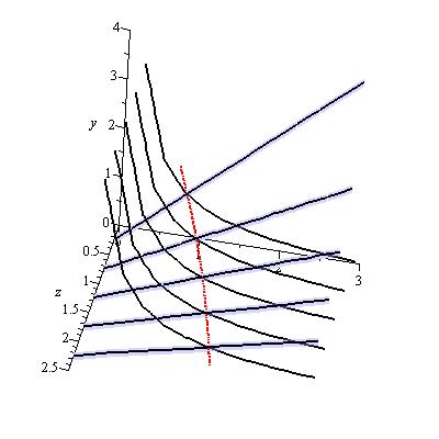> with(plots); display([implicitplot3d([y = 1/x, y = 2*x/(1+2*z)], x = 0 .. 3, y = 0 .. 4, z = 0 .. 2.5, numpoints = 100000, contours = 5, style = contour, thickness = 2, color = black, axes = normal), intersectplot(y = 1/x, y = 2*x/(1+2*z), x = 0 .. 3, y = 0 .. 4, z = 0 .. 2.5, numpoints = 100000, color = red, thickness = 2)]);